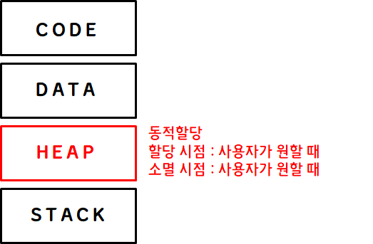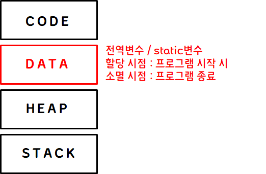 ๋ฉ๋ชจ๋ฆฌ ์์ญ์ ๊ตฌ์กฐ๋ CDOE, DATA, HEAP, STACK 4๊ฐ์ง ์์ญ์ผ๋ก ์ด๋ฃจ์ด์ ธ ์์ต๋๋ค.