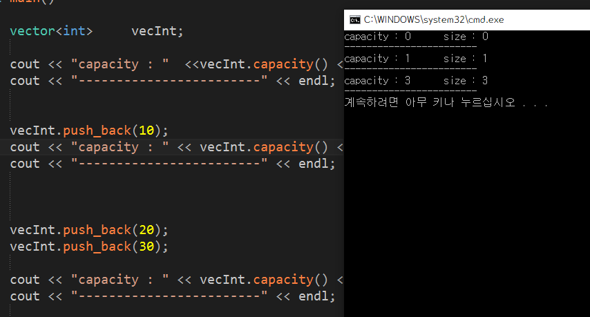 capacity : ํ์ฌ vector๊ฐ ์ ์ฅํ ์ ์๋ ์ต๋ ์์์ ๊ฐ์. ์ฆ, vector๊ฐ ํ ๋นํ ๋ฐฐ์ด์ ๊ธธ์ด.