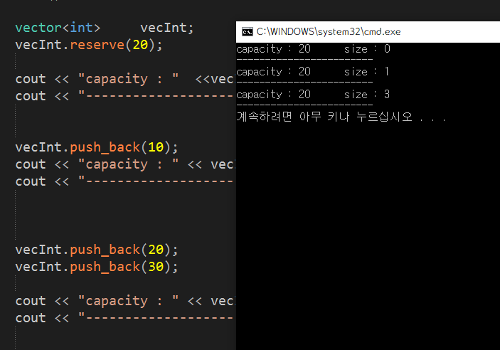 reserve : vector์ ๋ฉ๋ชจ๋ฆฌ ๊ณต๊ฐ์ ๋ฏธ๋ฆฌ ์์ฝํด์ฃผ๋ ํจ์.