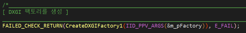 IDXGIFactory4* m_pFactory๋ฅผ ์ ์ธํ๊ณ , CreateDXGIFactory1() ํจ์ ํธ์ถ์ ํตํด ์์ฑํ ์ ์๋ค.