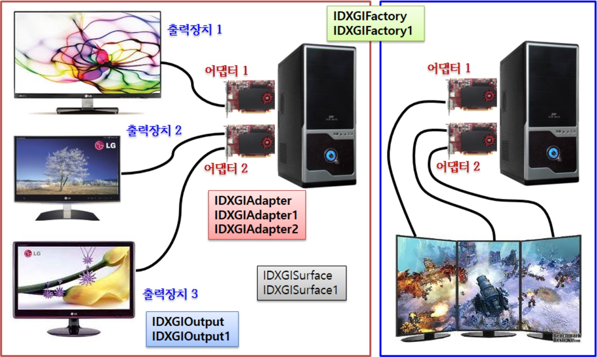 IDXGIFactory๋ ์ด๋ํฐ(Adapter), ์ถ๋ ฅ์ฅ์น(Output), ๋๋ฐ์ด์ค(Device)๋ฅผ ํฌํจํ๊ณ ์๋ ์ปด๊ฐ์ฒด์ด๋ค.
