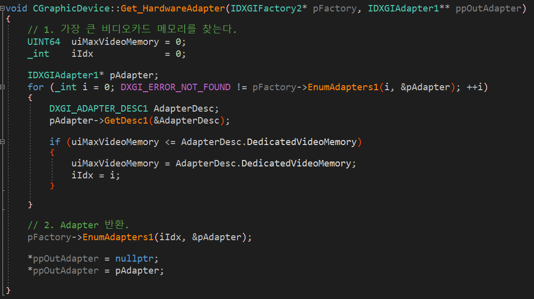 IDXGIFactory๋ฅผ ์์ฑํ๋ค๋ฉด ์ด์ IDXGIFactory์ ๋ด์ฅ ํจ์์ธ EnumAdapters1๋ฅผ ํตํด