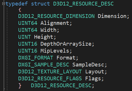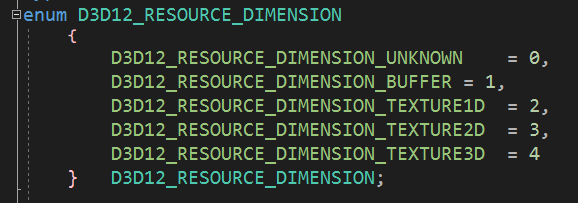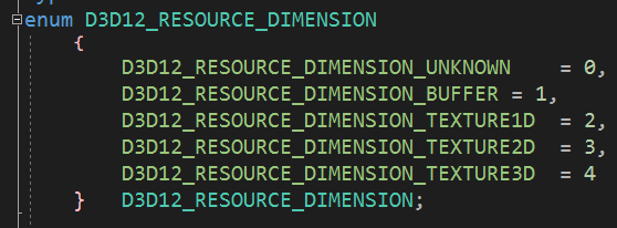 D3D12_RESOURCE_DIMENSION์ ๋ฆฌ์์ค์ ์์ฑ์ ์ค์ ํ๋ ๊ตฌ์กฐ์ฒด์ด๋ค.