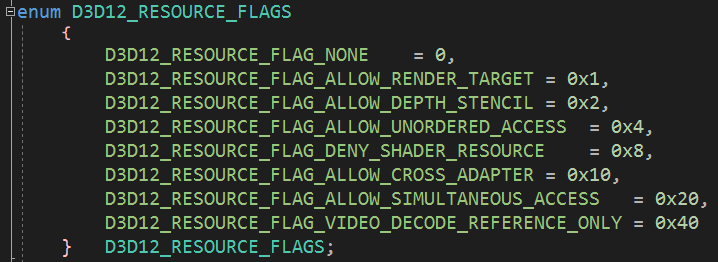 D3D12_RESOURCE_FLAGS๋ ํน๋ณํ ๊ธฐ๋ฅ์ด ์๋ค๋ฉด D3D12_RESOURCE_FLAG_NONE์ ์ค์ ํ๋ค.