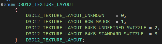 D3D12_TEXTURE_LAYOUT๋ ๋ฆฌ์์ค์ ์ฐ์์ ์ธ ๋ฉ๋ชจ๋ฆฌ์ ํํ๋ฅผ ์ด๋ค ๋ฐฉ์์ผ๋ก ํ ์ง ๊ฒฐ์ ํ๋ ๊ฐ์ด๋ค.