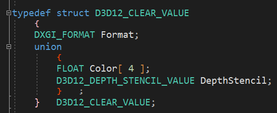 D3D12_CLEAR_VALUE๋ ๋ฆฌ์์ค๋ฅผ ์ด๋ค ๊ฐ์ผ๋ก ์ด๊ธฐํํ ๊ฒ์ธ์ง ์ค์ ํ๋ ๊ฐ์ด๋ค.