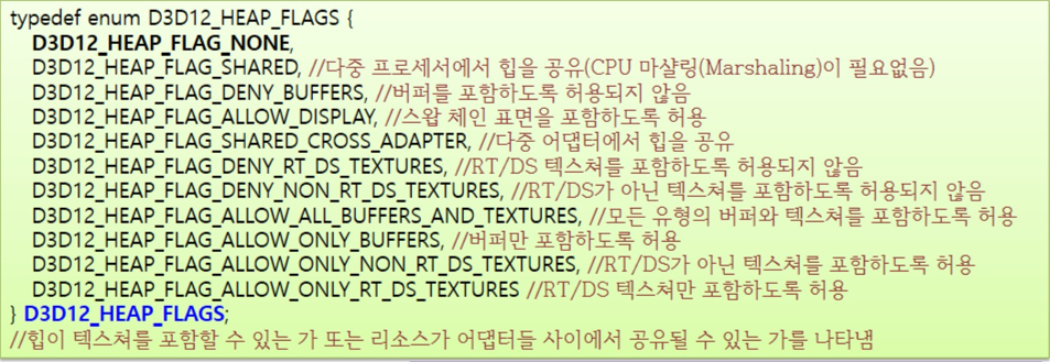 ํน๋ณํ ํ๋๊ทธ๊ฐ ์๋ค๋ฉด D3D12_HEAP_FLAG_NONE๋ฅผ ์ฌ์ฉํ๋ค. (์ฃผ๋ก NONE์ ์ฌ์ฉ)