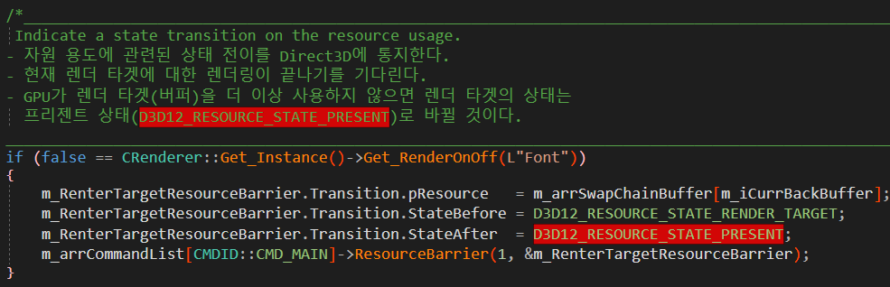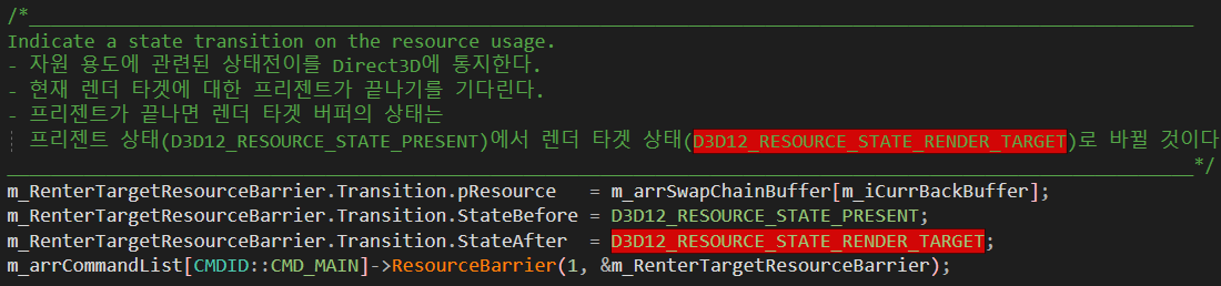 D3D12_RESOURCE_BARRIER ๊ตฌ์กฐ์ฒด๋ฅผ ์ฌ์ฉํ์ฌ ์ค์ ํ ์ ์๋ค.