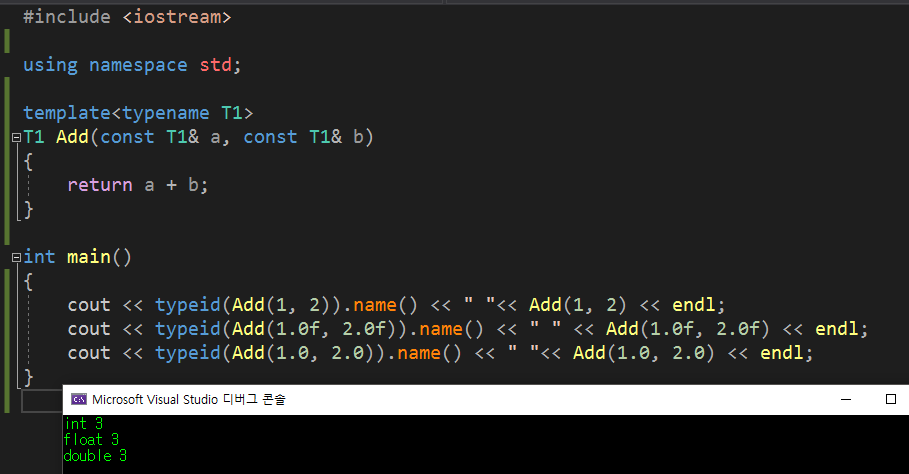 ์์ ํ ํ๋ฆฟ ํจ์ Add๋ ์ด๋ค ์๋ฃํ์ด๋๋ผ๋ ํจ์์ ์ ๋ฌ๋๋ ๋ ๊ฐ์ ์ธ์๊ฐ