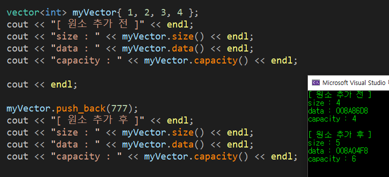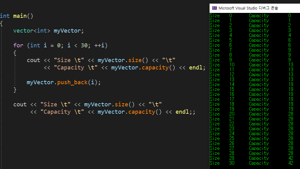 ํ์ง๋ง ์ด๊ธฐํ ์ดํ vector์ ์์๋ฅผ ์ถ๊ฐํ ๋ Size๊ฐ Capacity ๊ฐ์๋ฅผ ์ด๊ณผํ๋ฉด