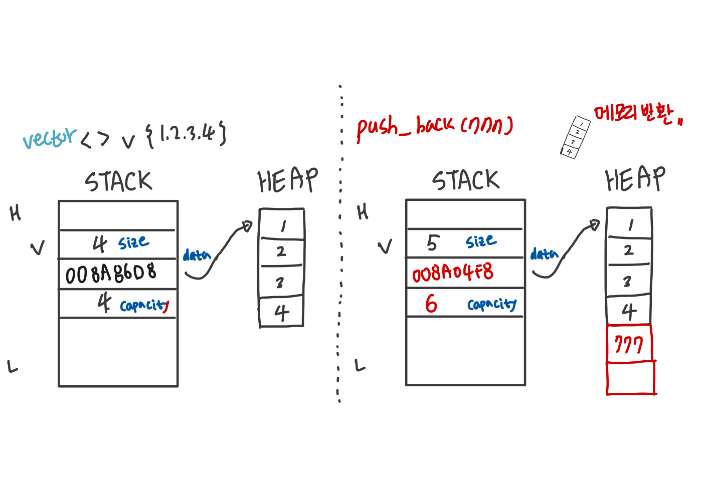 ์ฆ, ๋ฉ๋ชจ๋ฆฌ์ ์ฌํ ๋น๊ณผ ๋ณต์ฌ๊ฐ ์ผ์ด๋๋ค. ์ด ๋์์ด STL vector์ ํต์ฌ ๋์์ด๋ค.