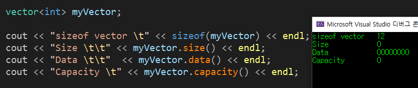 ์๋ฌด ์์๋ ์๋ vector์ Size, Data, Capacity๋ 0๊ณผ NULL ๊ฐ์ผ๋ก ์ด๊ธฐํ๋ผ์๋ค.
