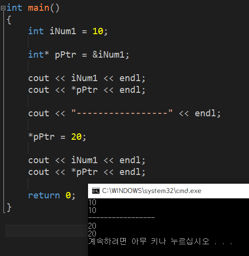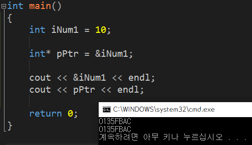 ์ด์ pPtr์๋ iNum1์ ์ฃผ์ ๊ฐ์ด ๋ด๊ฒจ์์ต๋๋ค.