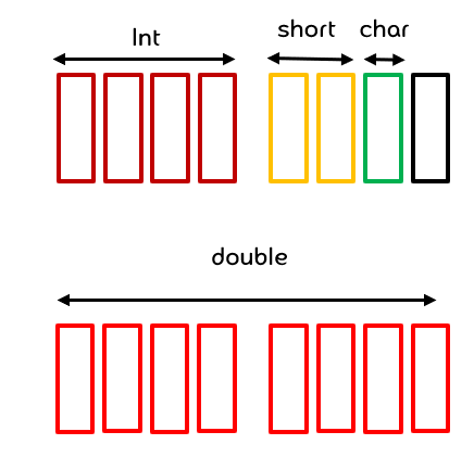 ์ดํ ๋๋จธ์ง ๊ณต๊ฐ์ ๊ฐ๊ฐ ์์๋๋ก short(2๋ฐ์ดํธ), char(1๋ฐ์ดํธ) ์๋ฃํ์ ํฌ๊ธฐ๋งํผ ํ ๋น์ด ๋ฉ๋๋ค.
